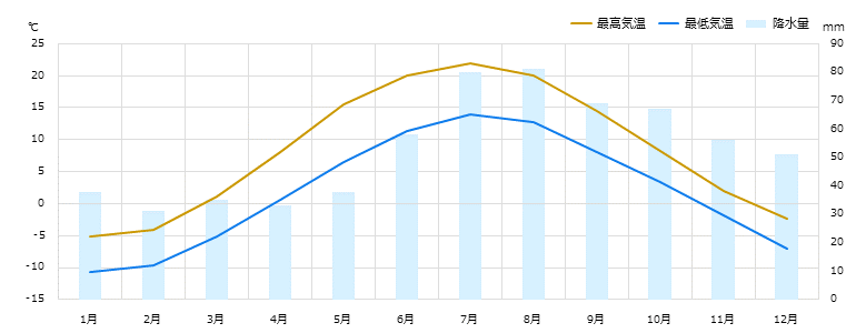 春、秋は日本の初冬ぐらいの服装をイメージすると良い。厚手のコートやダウンジャケットまでは必要ないが、寒暖の差が大きい季節であるため温度の変化に対応できる服装を用意したい。夏は日中は30度を超え汗ばむ日もあるが、朝晩に冷えたりするので、半袖のTシャツや、上から羽織るもの等を用意して温度の変化に対応できるようにしたい。冬は寒さが厳しく、最大限の防寒をしたい。靴も雪に滑りにくいようなブーツを用意すると良い。1月 2月 3月 4月 5月 6月 7月 8月 9月 10月 11月 12月 旅行ベスト