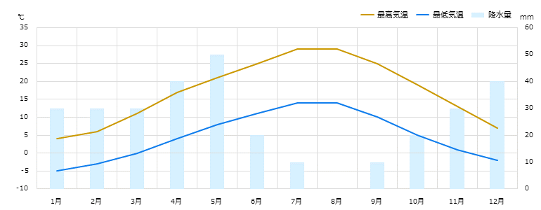ステップ気候のため空気は乾燥している。夏は陽射しが強く、帽子、サングラスと、また、夕方から涼しくなるため、夏でも長袖を用意したほうがよい。冬は雪が積もるので、準備が必要。1月 2月 3月 4月 5月 6月 7月 8月 9月 10月 11月 12月 旅行ベスト