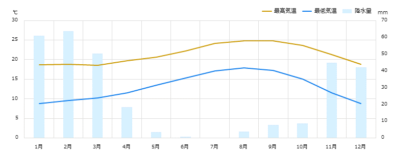 夏は18~29℃、冬は10~20℃で、湿度も低く過ごしやすい気候。また、5~9月は雨がほとんど降らない。夏は乾燥と日差しの強さ、冬は朝晩と昼の寒暖差に気をつけよう。服装