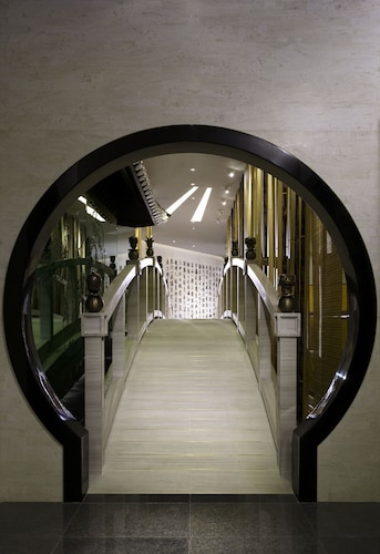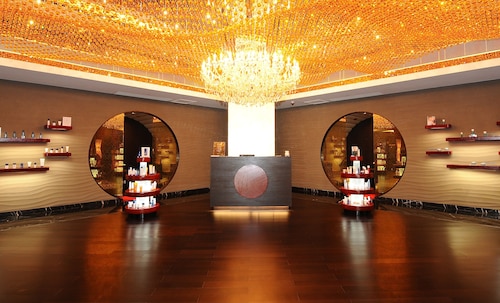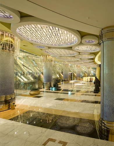 天井には、巨大なスワロフスキーのクリスタル製シャンデリアを飾ったゴージャスなエントランスに、まず驚かされます。