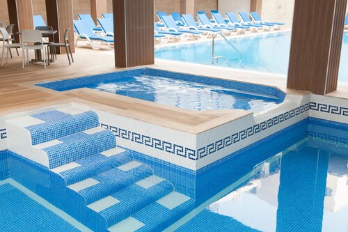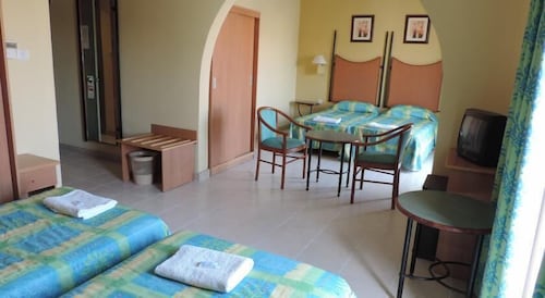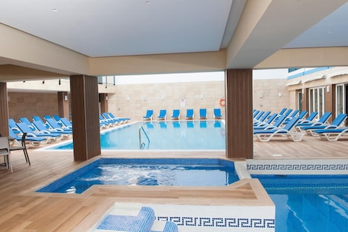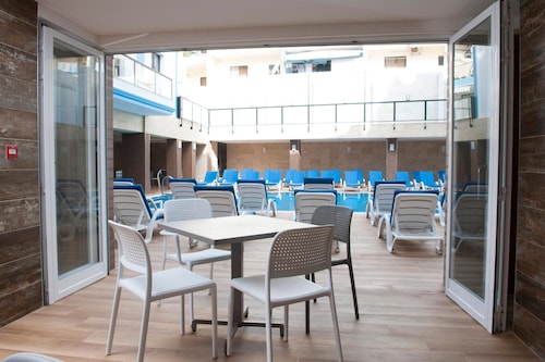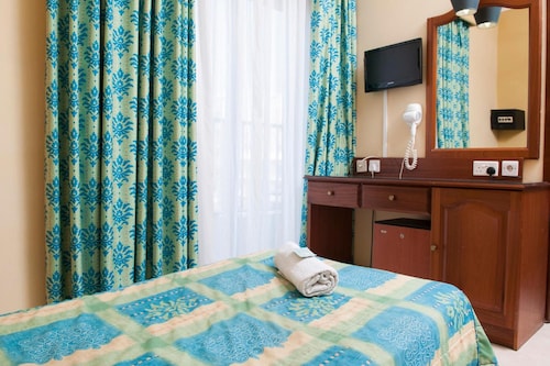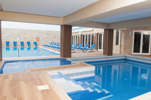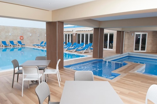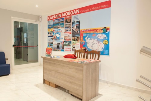 空港からの距離は約17km。タクシーで約45分。セントジュリアンとチルケッワ(ゴゾ島・コミノ島へのフェリー乗り場)の中間に位置する,アウラ/ブジッバエリアのシンプルな3つ星ホテルです。ホテルから海岸までの距離は600mです。また、マルタ各方面へ向かうバスが乗り入れしているバスステーション(ブジッバベイ1)へは徒歩2分で行くことができます。ホテル周辺は飲食店・土産屋が多く、すぐ近くにはスーパーもあります。その他、ザ・マルタクラッシックカーコレクション(ミュージアム)へは徒歩4分、ブジッバ・ビーチ(岩場に砂を敷いたビーチ)へは徒歩9分、カジノへは徒歩8分、水族館へは徒歩9分、塩田のあるサリーナ国立公園へは徒歩16分で行くことができます。尚、砂浜での海水浴には、黄色い砂のゴールデンベイ(西へ6km)もしくは、マルタ一広く美しいメリッハ・ビーチ(北へ6km)へ行くことをお勧めします。ホテルの外装は爽やかなブルーと白。エントランス付近にはテラス席があります。清潔な印象を受ける館内には、レストラン・カフェテリア・パブ・自動販売機(スナック・飲物)等があります。中庭には、フローリングがオシャレな屋外・室内プール(ジャグ