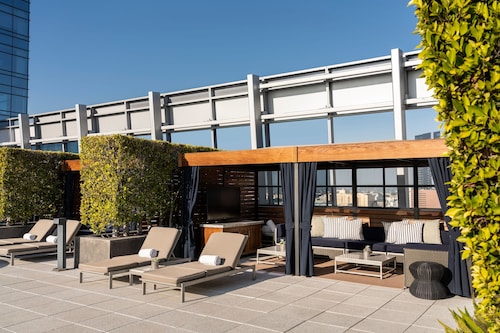 LAの市街とバックの山側の景色を望む26階高層階に設置された屋外温水プールとジャグジー。広々としたフィットネスセンターも完備されています。