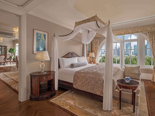 外灘の「旧上海総会」のビルは1911年にイギリス人たちの社交場として建てられたもので、現在も約100年前のエレベーターやパーティールームがそのまま稼働しています。これらを擁しているのが「ウォルドルフ アストリア 上海 オン ザ バンド」。文化財建築部分と新しい棟から成る上海トップクラスのホテルです。 こちらのホテルの経営母体は、アメリカ・マンハッタンの最高級オールドホテル。同ブランドのホテルはアジアではここだけです。しかもオランダ皇室の関係者がスタッフのサービス研修を行なっているそうで、上海のほかのホテルとは明らかに違う格調の高さを感じることができます。 歴史建築部分には20室のスイートルームがあります。ただし、常に予約は埋まっている状態とのこと。クラシカルな調度品に天蓋付きのベッド、窓からの外灘の夜景、エルメスの無料アメニティグッズなど、足を踏み入れるだけでロイヤルファミリーの一員気分になれるお部屋が用意されています。 新館には比較的リーズナブルなシティビューのお部屋も。ただし、大理石のバスルーム、パソコンとして使えるフラットテレビ、フェラガモの無料アメニティグッズなどが標準で用意されており、こちらでも