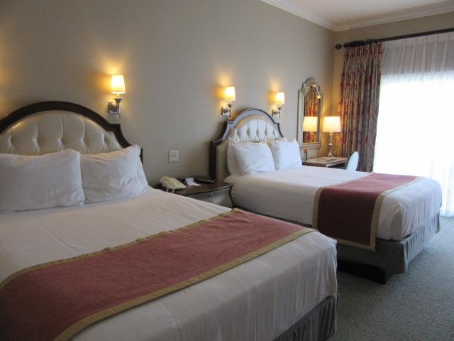 スタンダードルームは落ち着いた雰囲気でインテリアなどは高級感があり、クイーンベッド2台とプルダウンベッド(ソファの背を引っ張るとシングルベッドになる)が1台あり、最大5名まで宿泊が可能です。さすがディズニー直営ホテル、お部屋の至る所に隠れミッキーがいますが、シックにまとまっているところもステキです。