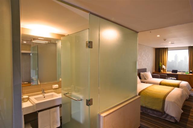 客室はダブル、ツイン、ファミリー、トリプルの4種類があり、禁煙室もあります。寝具へこだわり、シモンズポケットスプリングベッドとひのき枕、薬草枕、黄土炭枕が用意されているのはとてもありがたいですね。また、デラックスフロアの客室には、フットマッサージ器やイオン酸素発生器、アイパックや伝統茶ティーセットなどが設置され、ワンランク上のサービスを楽しむことができます。洗浄機付トイレ付ですが、浴槽は一部の部屋にのみ有ります。歯磨きセット、髭剃りが必要な場合はフロントで借りましょう。