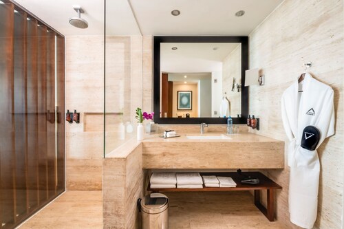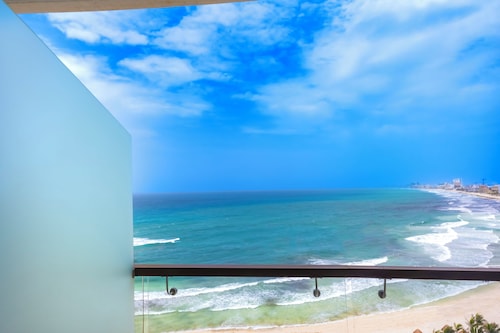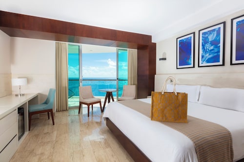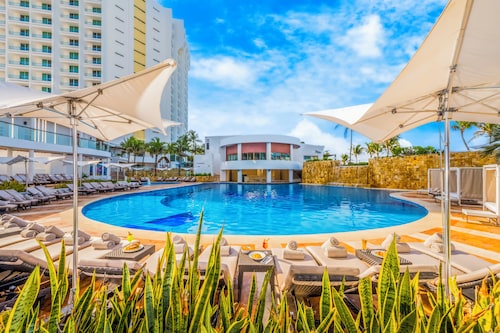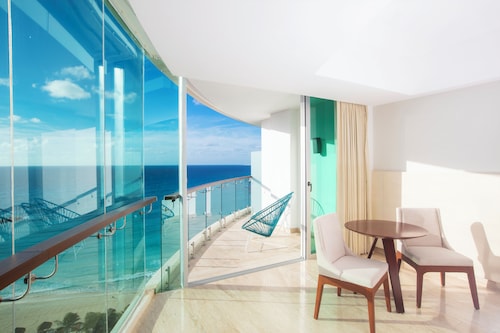 クリスタル グランド プンタ カンクンは円柱状の建物で、コンテンポラリーな雰囲気が漂うホテルです。岬の先端に位置しているため、ビーチに出るとホテルゾーンを一望できます。