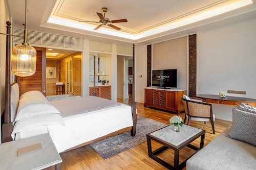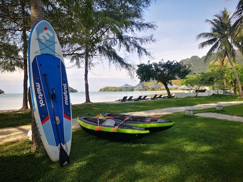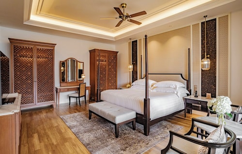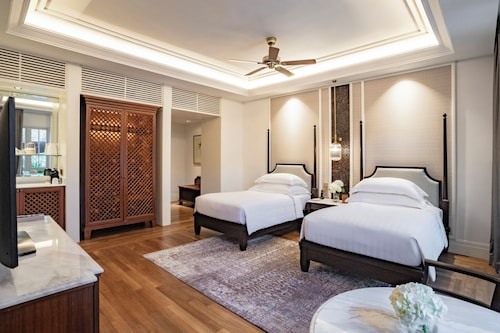 贅沢な大型ヨットが停泊するテラガハーバーのマリーナに面する、ランカウイでは珍しいコロニアル調の建物。ベルマンに迎えられ、ロビーの扉を入ると、高い天井にクラシカルなシーリングファンが回り、ひんやりとエアコンが効いていてほっとする。チェックインの時には、スパのスタッフがやってきてロビーで疲れを癒す肩もみのサービスがあり、いきなりVIPになったような贅沢感が味わえる。グランドフロアにあるレストランやカフェなども、古きよきヨーロッパ植民地風に統一され、客室も「クラシカルなヨーロッパ風」にこだわった少々大仰な家具使いが特徴。客室によっては天蓋付のお姫様ベッドの場合もある。回廊のようになった館内は、どのエリアも広々とした中庭に面していて、明るく日が差し込み、夜は幻想的にライトアップされる。高い天井のピアノラウンジや、ランカウイで最も充実した本格的シガーバーがあり、夜になると洗練された大人の社交場といった雰囲気を醸し出している。ランカウイ最大級のプールは、ビーチチェアでくつろいだ時に、水平線がちょうど足元にくる抜群のバランスで設計されていて、のんびりカクテルを飲みながらくつろいでいると、夕方には足先に夕日が沈んでくるよ