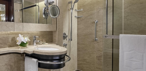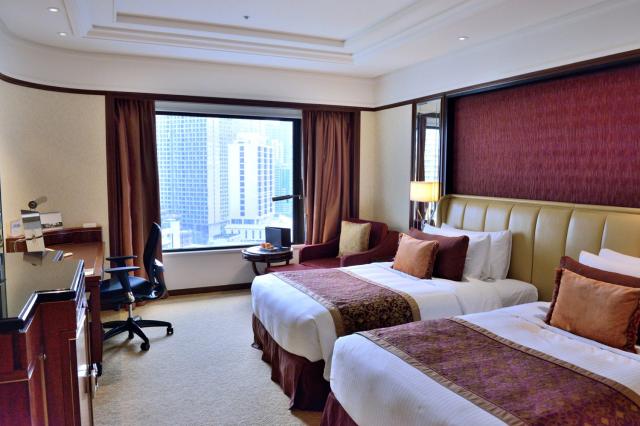 シャングリラホテル・クアラルンプールは、KLタワーがあるブキナナスの丘をバックに建つ老舗デラックスホテルです。日本人の出張者にも人気の高いホテルです。ロビーに一歩足を踏み入れると、単に広くて豪華と言うだけではない、どっしりとした落ち着きを感じるロビーの雰囲気に、他のホテルとの違いを感じる事でしょう。2階まで吹き抜けの高い天井、その天井を飾る巨大なシャンデリア、涼しげな噴水、お花もたくさん飾られています。このホテルは、雰囲気だけでなくサービスもハイレベルです。カウンターのスタッフもとても親切です。日本人の宿泊客が多いこともあって、日本人の対応にも慣れています。もちろん、日本人スタッフが常駐していますので安心です。客室も同じく、重厚で落ち着きがあり使い勝手も申し分ありません。一番数が多いエグゼクティブルームで39㎡とゆったりしており、無料ワイファイ、NHK視聴可能なテレビ、セフティーボックスなど必要なものは全て揃っています。マレーシアでは、トイレにウォシュレットが設置されていることは、ほとんどありませんが、このホテルにはダイヤル式で水が出る簡易式のエコウォッシャーが付いています。大理石のバスルームは、バスタブ