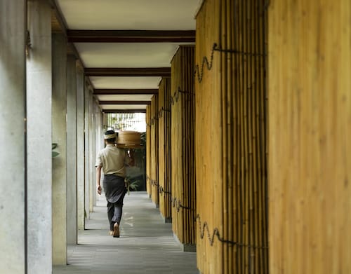 部屋はビル棟で、2階建と3階建ての2つのビルディングに分かれています。客室は2種類、デラックスルームとアラヤルーム。数は多く60室あります。周りが田んぼなので、すべてライステラス・ビューです。広さは同じ、50㎡。違いはバスタブがあるか、ないか。