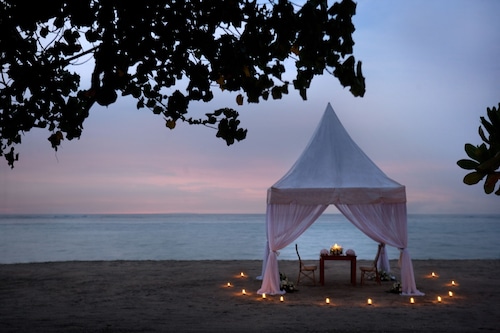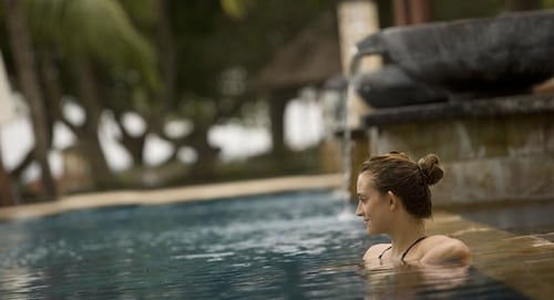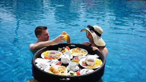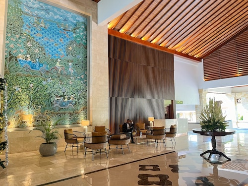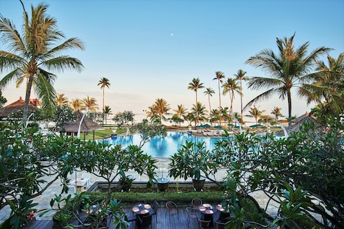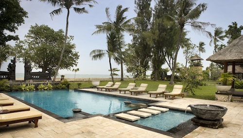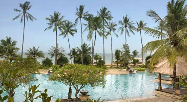 空港のすぐそばなので、エアラインのクルー等もよく利用するホテル。広々としたロビーの奥にプール、そしてその向こう側には海が見渡せます。ロビーのイメージから一見、巨大なビルタイプのお部屋を想像してしまいそうですが、奥へ進むとコテージタイプのお部屋が点在し、空港のそばとは思えないほど緑も多く、バリらしいイメージが感じられます。何といっても空港の敷地内かと思う程、空港から近い。徒歩で出歩くのはちょっと厳しいですが、ディスカバリーモール(ショッピングセンター)やレストランが立ち並ぶカルティカプラザ通りにも車で10分程。サーフスポットのエアポートリーフはホテルのすぐ裏側にあります。客室は、2階建てのコテージタイプでバリらしさが感じられます。2階のお部屋にはバルコニーがありますが、少し狭くて椅子がなかったのが残念。お部屋の中はデラックスルームでも43㎡とゆったりしていて快適です。バスルームもシャンプーや歯ブラシ、ヘアドライヤー等が揃っていて快適。シャワーヘッドは固定式ですが、特にデラックススイートでは、独立式のシャワーブースがあったり、バスタブも大きくてくつろげます。プールサイドのレストランが朝食会場になっていて、眺め