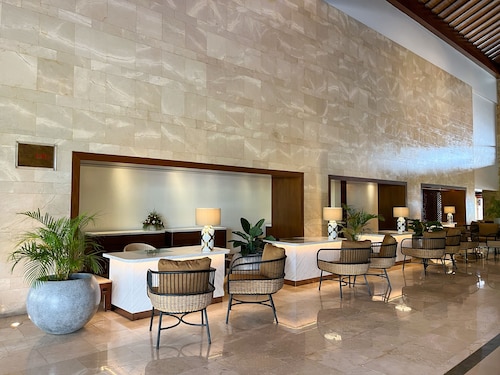 広々としたロビーの奥にプール、そしてその向こう側には海が見渡せます。