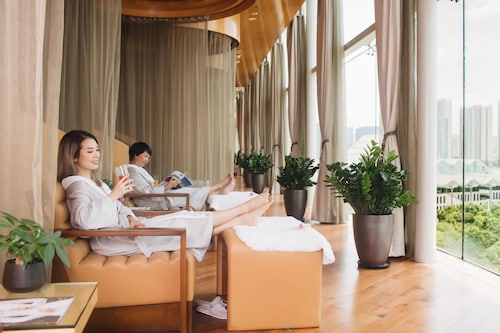 部屋は いずれも、広く明るくゆったりとして、とても豪華です。全部で450室、デラックスルーム、 デラックススイート(シティ/レイク、エグゼクティブ、エグゼクティブスイートの3タイプ、キングベッド1とキングベッド2の2種類があります。大きな窓のカーテンがベッドサイドのスイッチで自動開閉でき、コーヒーメーカーも用意されています。アメニティも豪華で、シャワー室とトイレが別々になっています。設備も揃っており、文句なしに快適に過ごせますね。