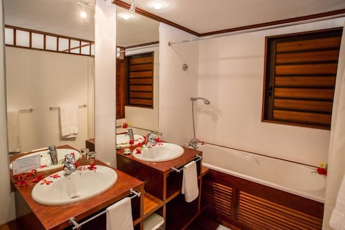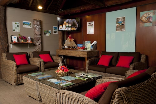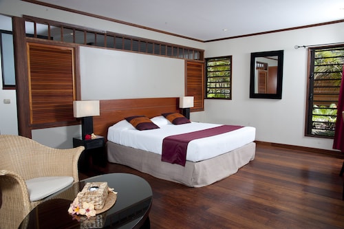 空港から20分、カレドニアの数あるビーチの中で人気1・2位を争うカヌメラビーチ。指の間からサラサラこぼれる白砂が続く浜はヤシの木に縁取られ、驚くほど高い透明度の海は大変静か、手入れの行き届いた熱帯植物が香る庭園も。そんな風景に溶け込んだモダントロピカルスタイルのバンガローは、海に面したビーチバンガロー、鬱蒼とした庭向きのトロピカルバンガロー、つなげれば6人まで滞在可のガーデンルームの3種。室内はゆったりした広さ、木をふんだんに使った内装・調度は庭園の続きのようで落着けます。プールは小さいですが、ここまで来たのなら目の前の静かな海を思う存分利用したいもの。周囲をリーフが囲んでいるカヌメラビーチは、波も穏やかで水遊びしやすく、無料で貸し出してくれるシュノーケリングセットで、熱帯魚を観察するにはうってつけ。デッキチェアはありますが、数が少なく壊れているのもあります。島の西部に位置するので、水平線に沈む幻想的な夕陽を正面に見ることが出来るのは感動!レストラン「カヌメラ」では新鮮な魚介、ロブスター、イルデパン名物のエスカルゴ(先がとがった形の貝)、カレドニア郷土料理ブーニャなどを味わえます。朝食もここで。ランチから
