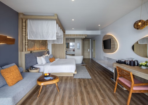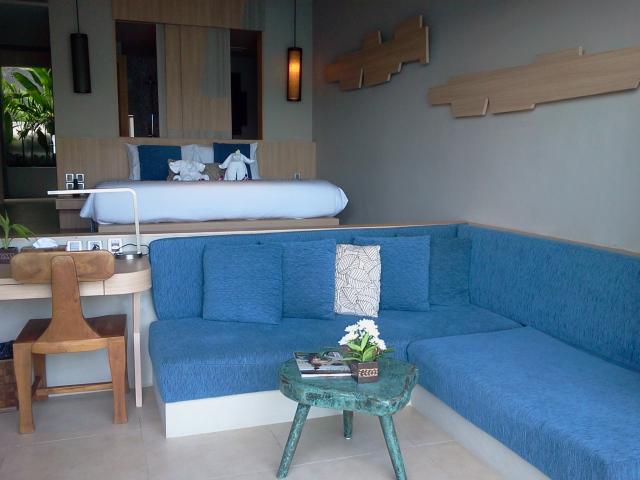 キングサイズのベットとゆったりと寛げるソファスペースがあり、外に出るとプライベートのジャグジーと同部屋タイプと共有のプールがあり、プールからはカリムビーチが一望出来ます。