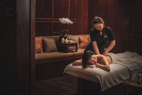 中国的な要素とモダンが融合した落ち着きのあるトリートメントルームで、
