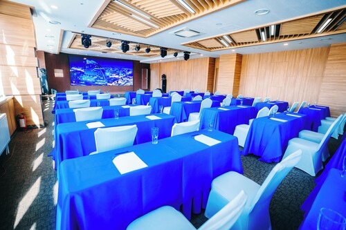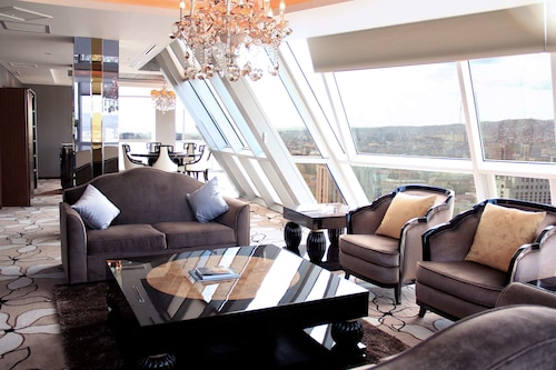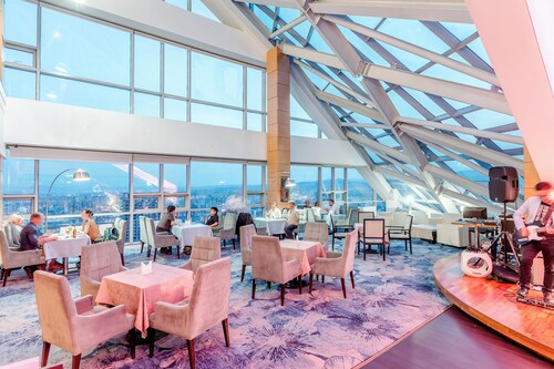 スフバートル広場の正面に、半月形の印象的な建物が、青い空から切り取られたようにすっくと立っています。これがホテルThe Blue Skyです。その名の通り、ガラス張りの建物には、モンゴルの青空が映し出されています。宿泊する部屋も、一面に窓が大きく取られており、明るくてとても気持ちが良いです。国会議事堂を含むスフバートル広場の真ん前のロケーションですから、博物館へ行くにもショッピングへ行くにも、文句なしに便利です。各部屋にバスタブもちゃんと付いていますが、特筆すべきはこのホテルのアメニティ。すべての部屋のシャワージェル、シャンプー&コンディショナー、ボディローションがロキシタンなんです。ちょっぴり贅沢気分を味わえます。朝食は、国会議事堂を横目に眺めるレストランでいただきます。ここも窓が大きくて気持ちがいいです。このホテルにはジムの他に20メートルのプールもあり、宿泊客は自由に使うことができます。モンゴルの青い空の上で、快適なステイを楽しみませんか?