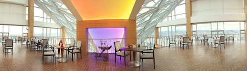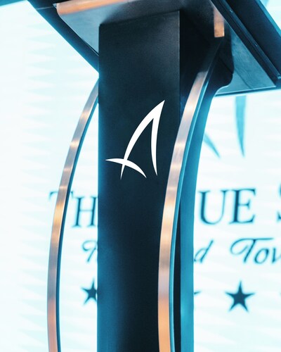 空に映える青い半月形のホテル