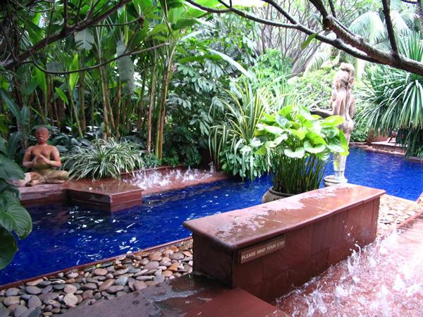 ビジネスでの利用も多いホテルですが、熱帯植物の生い茂るプールは