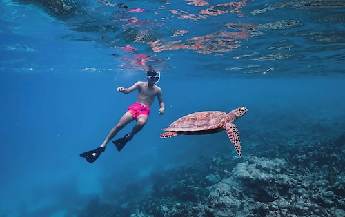 周囲を美しいラグーン(浅瀬の海)で囲まれたミールアイランドリゾートは、リゾートホテル島では大きめの島で、縦は1.2km、横幅は350m。1周歩くと約1時間かかるので、散歩しても飽きない広さです。