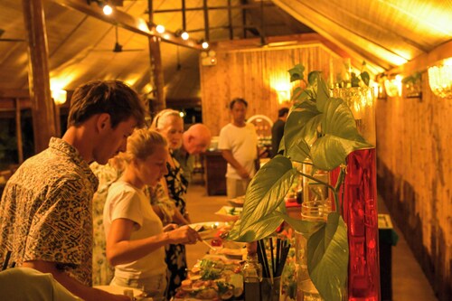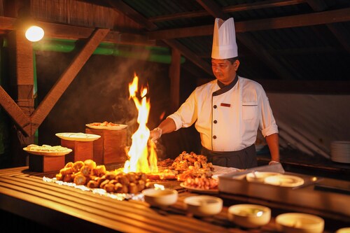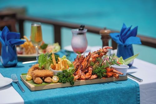 リゾートホテル滞在時に気になるのはお食事。マクヌドゥアイランドには一つのメインブッフェレストランしかありませんが、それでも宿泊客を飽きさせない工夫がなされています。それは、通常のブッフェメニューがセットメニュー(コースメニュー)へと変更されるサービス。稼働率によって頻度は変更されるそうですが、時々ランチまたはディナーがセットメニューになります。バラエティ豊富なブッフェ形式も楽しいですが、たまにセットメニューへと変わると特別感のあるお食事に。そのため、長期滞在の宿泊客も3食飽きることなく楽しむことができます。さらに、お飲物がついてないお食事プランの宿泊客でも、お食事中はミネラルウォーター、ソフトドリンク、コーヒー・紅茶が無料で提供される嬉しいサービスも。