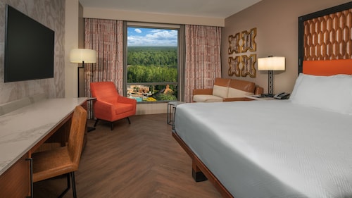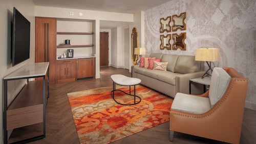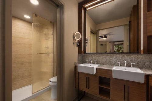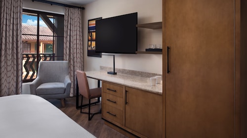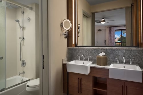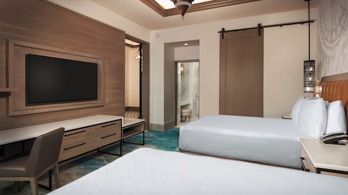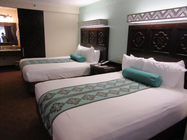 エキゾチックで陽気なメキシコ気分が味わえるリゾート、ディズニー・コロナド・スプリングスは、モデレートというディズニー直営ホテルの中ではデラックス/モデレート/バリューの3段階のうち、中間クラスのホテルです。広大な敷地には、カラシス、ランチョズ、ガバナーズと名づけられた3つのエリアがあります。各パークへの無料シャトルバスはフロントを出た正面玄関からだけではなく、敷地内にバス停がいくつかあるので、お泊りのお部屋から一番近いバス停から乗り降りできます!本館の「エル・セントロ」には、レセプション、ギフトショップ、フードコート、レストランなどがあります。テーブルサービス・レストラン「MAYA GRILL」では、メキシコ料理に加え、ステーキやシーフードなど幅広いメニューを味わうことができます!通常は夕食のみの営業ですが、繁忙期には朝食も営業することがあります。フードコートのメニューも種類豊富で、朝食にはオムレツ、パン、パンケーキなどに加え、ファヒータなどもあります。また、昼食、夕食ではエンチラーダ、タコスなどのメキシコ料理と、ハンバーガー、サラダ、リブなどのメニューを楽しむことができます。スタンダードルームは茶色とグ