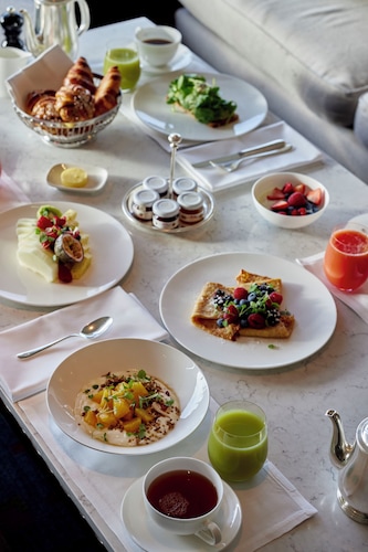 客室内は、5つ星のホテルに相応しい、落ち着いた雰囲気にまとまっています。バスルームも広く、大きなバスタブでゆっくりアロマバスも楽しめます。アメニティは、イタリアのブランド、アクア・ディ・パルマ(Aqua Di Parme) のものを使っています。エレガンスの象徴ともいわれるフレグランスは、これまでも多くの有名人にも愛用されてきました。