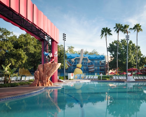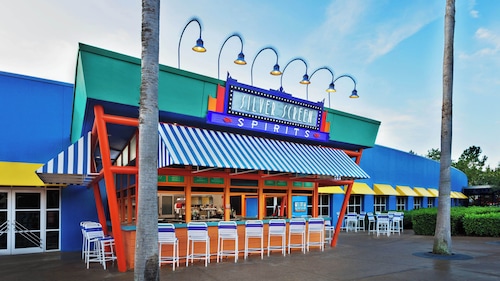 デラックス/モデレート/バリューの3段階からなる直営ホテルのうち、リーズナブルに泊まれるバリュークラスのディズニー・オールスター・リゾートには、ムービー、スポーツ、ミュージックの3つのリゾートがあり、各々テーマに沿った建物のデザインやインテリア、オブジェなどが楽しめます。中でも人気No.1のホテルがオールスター・ムービーリゾート!ディズニー名作映画『トイ・ストーリー』『ファンタジア』『ラブ・バッグ』『101匹わんちゃん』『飛べないアヒル』をテーマにした5つの棟があり、それぞれの世界観が楽しめます。メインの棟にはレセプション、ギフトショップ、フードコートがあります。バリュークラスのホテルには食事をサーブしてもらえる、テーブルサービスのレストランはありませんが、大きなフードコートがあり、映画館のような雰囲気を楽しめるデザインになっています。ピザ、ハンバーガーなどのファーストフードから、オムレツ、クレープなどメニューも豊富です。また、電子レンジやトースターもあるので、売店で買える軽食やパンを温めて食べることもできます。プールはファンタジア、飛べないアヒルの棟の2箇所にあります。全てのディズニー直営ホテルのプール