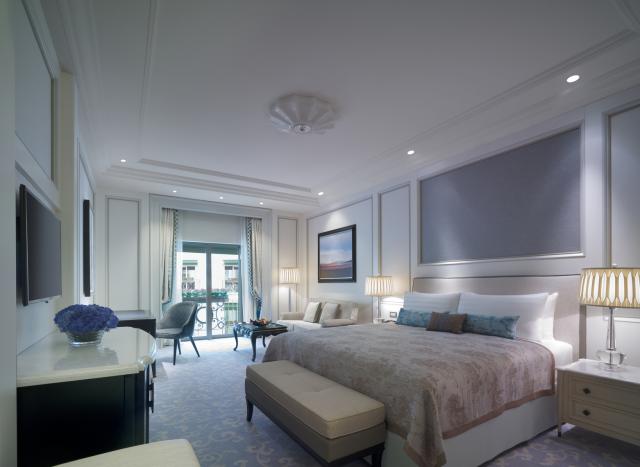 お部屋はデラックスルームから。広々としたお部屋は優しい色合いでボスポラス海峡の水をイメージしたソフトブルーの小物がアクセントに。ほとんどのお部屋にホテル中庭が見渡せるフレンチバルコニーがついています。