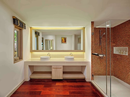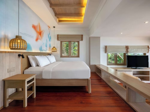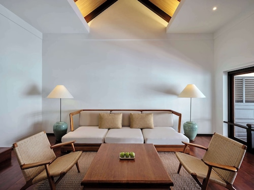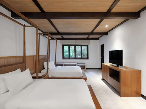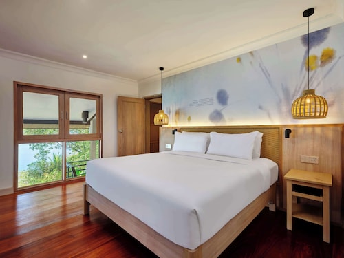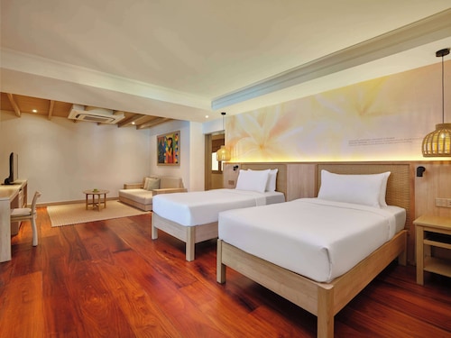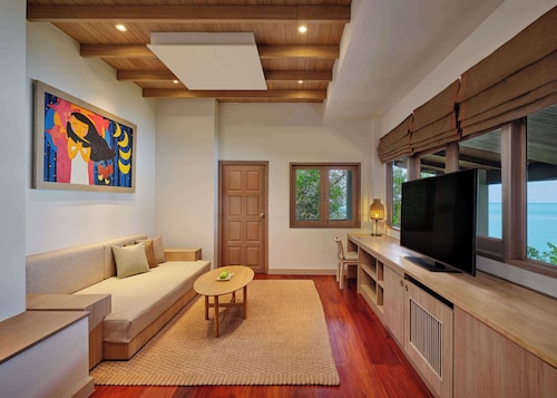 空港から車で約15分の島の北東部の小さなトンサイ湾に面した山の傾斜にリゾートがあります。コテージは山のもともとの自然を壊すことなく点在し、リゾート内の移動では、山のコテージに来たような錯覚に囚われる木々の溢れる通路を行きます。カートで楽に移動できます。25エーカーという広大な敷地なので、端から端までの散歩は十分良い運動になります。