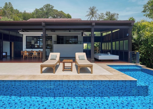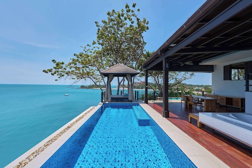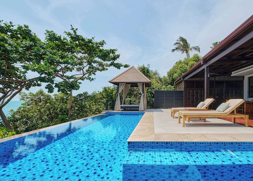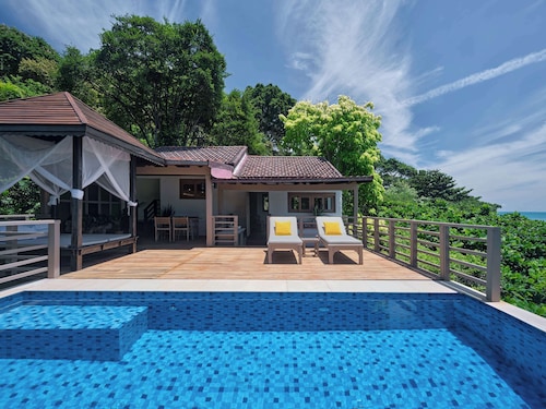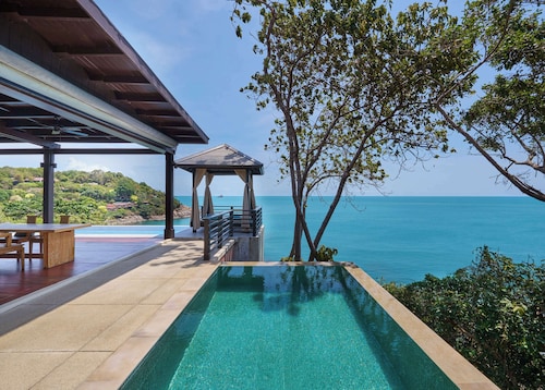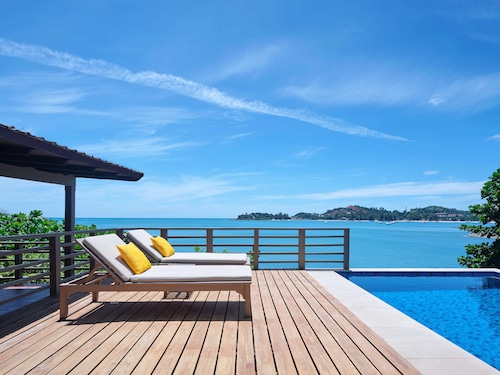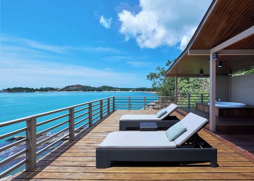広いテラスに天蓋のある東屋とシービューバスタブの写真が、旅行パンフレットや雑誌やテレビのサムイ特集に良く登場している、サムイの高級リゾートの代名詞的な1987年オープンのサムイ最初の5スターリゾートです。海を見ながら、南国でバスタブに浸かるって、非日常ですよね。一度はこのバスタブに!という事で、ハネムーンで宿泊されるゲストも多く、日本人にも大・大・大人気のリゾートです。日本語のリゾート案内や日本語レストランメニューがあり、頼りになる日本人スタッフも常駐。タイ人スタッフも多少の日本語を話せる人が中にいて、親身で笑顔が素敵な人が多いです。空港から車で約15分の島の北東部の小さなトンサイ湾に面した山の傾斜にリゾートがあります。コテージは山のもともとの自然を壊すことなく点在し、リゾート内の移動では、山のコテージに来たような錯覚に囚われる木々の溢れる通路を行きます。カートで楽に移動できます。25エーカーという広大な敷地なので、端から端までの散歩は十分良い運動になります。ルームタイプは、ビーチに近いビルディングの他はコテージタイプで、色々なタイプがあります。良く被写体として登場するのはトンサイグランドヴィラ。ゆったり