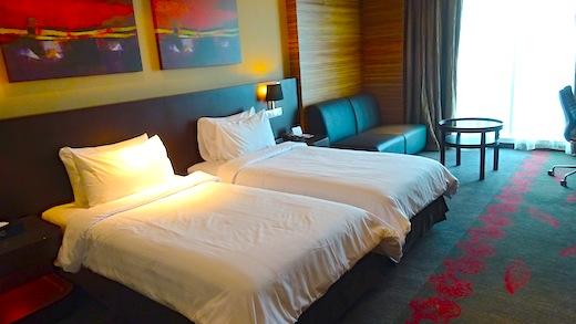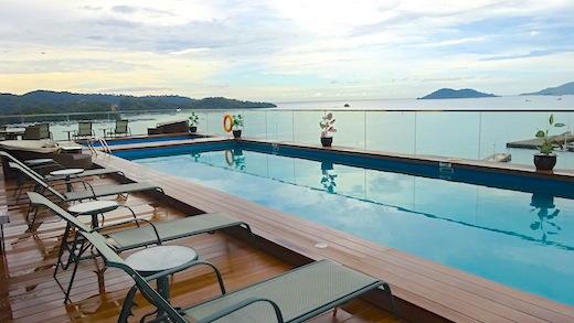 ホテルグランディスは2014年にオープンしたばかりの新しいホテル。ショッピングセンター「スリアサバ」に隣接しています。「グランディス」という名前はキナバル固有種の蘭の名前から取られたそうです。ホテルの裏が海に面していて眺めが最高です。一方すぐ隣ではコンドミニアムの建設工事をしているので、そちらに面している側のスーペリアルームは景観いまいち。ちょっと予算をあげてでもデラックスシービュールームがおすすめです。スーペリアのお部屋にはバスタブはありませんが、デラックスにはバスタブも付いています。ホテルの隣がスターバックスで8:00〜24:00の営業なので、ホテルの朝食が含まれていないプランの場合は朝8時以降はそちらで朝食をとることも可能です。隣のショッピングセンター、スリアサバの中にはレストランやスーパーも入っています。ホテルの屋上にはプールとカフェがあり、そちらも眺めが素晴らしいので、天気のいい日はぜひ屋上にも上がってみてくださいね。