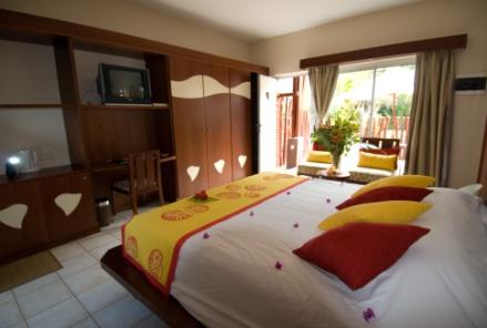 客室はメラネシアンのカーズ(家屋)をイメージしたバンガロータイプと2階建てのホテル棟がありバンガロータイプは2~3名利用のコンフォート・バンガロー、5~6名利用のデラックス・バンガローがある。