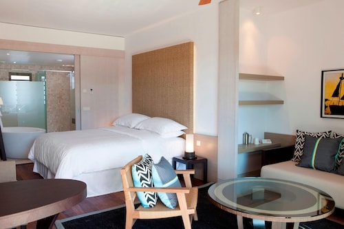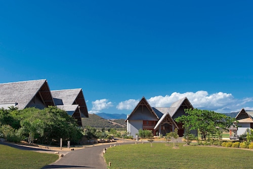 車で2時間、街の喧騒を逃れたいヌメアっ子のお気に入り週末スポット、ポエビーチ。耳を澄ませば沖のサンゴ礁上に沸き立つ波、足元に転がるのはヒメシャコガイの貝殻。対する丘には18ホールのゴルフ場がなだらかに広がる。そんな800haの自然保護区にオープンしたばかりのシェラトンは、そのほとんどが伝統的メラネシアンカーズ風の造りで、周囲の環境に見事に溶け込んでいます。高く突き抜けた天井に圧倒されるフロントホールから奥のレストランへと続くメイン館は、通り抜ける風が心地良い。籐のランプ・いす、木の床と調度品全てがブラウンで統一、落着いた色調はまるで森に迷い込んだかのよう。宿泊はバンガローから2階建て棟内の数々のカテゴリーまで多彩。プライベートテラス付きのバンガロー内は白が基調、ゆったりめの室内は天蓋付きベッド、小さなサロン、デスクに、シンプルだが趣味の良い照明があちこちに。特筆すべきは自然光を存分に活かしたバスルーム。アイランドバスタブ、平たい白石を嵌め込んだ壁、はしご型のタオルハンガーなどのディテールが、シンプルな贅沢さをかもし出していて長湯したくなること請け合い。ランチタイムは「Sand Beach Grill」で。