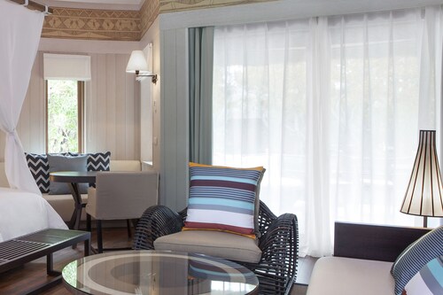 ゆったりめの室内は天蓋付きベッド、小さなサロン、デスクに、シンプルだが趣味の良い照明があちこちに。