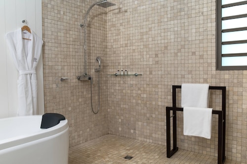 アイランドバスタブ、平たい白石を嵌め込んだ壁、はしご型のタオルハンガーなどのディテールが、