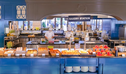 また翌朝の朝食会場の充実ぶりにも目を見張りました。会場の広さに加え、お料理の質、種類も申し分ないゴージャスさ。特にお野菜料理やサラダ類、それに使うドレッシング類やトッピングが驚くほどたくさんあって、朝食の時間がとても楽しいものになりました。