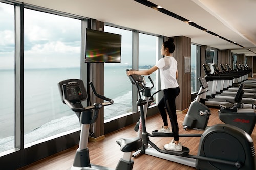 ホテル内にあるジムは大きなガラス張りとなっていて、海や街を見下ろしながらエクササイズを楽しめます。ジム用のシューズを持っていなくても、ヨガマットを使ってストレッチなども楽しめるので、気軽に利用してみてもいいと思います。