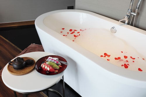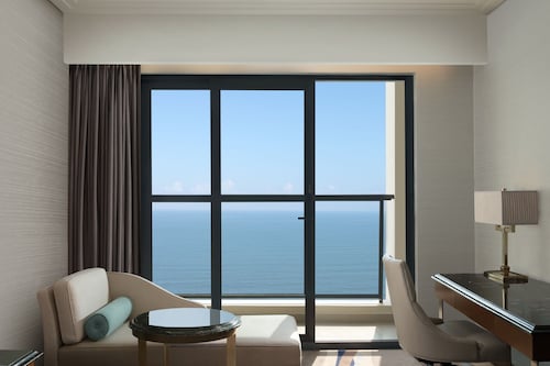 お部屋に入ってまず驚いたのは眺めの良さ! 眼下には広く青い海が広がり、とても見晴らしが良かったです。また、海が見える方向とは反対側にバスルームがあり、バスタブは床より一段高い場所に作られていて、大きなガラス窓からダナンの街を見下ろしながら開放的な気分でお風呂を楽しめました。