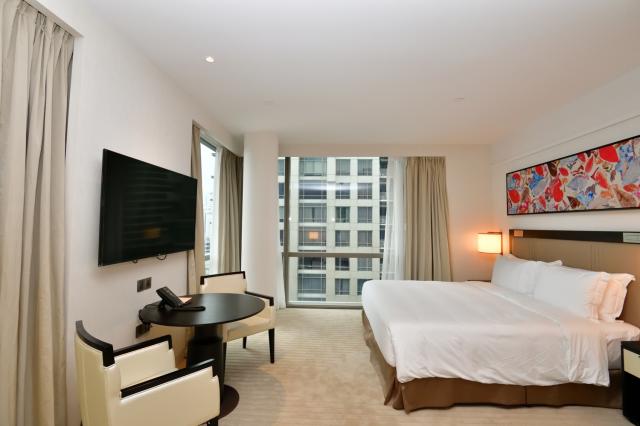 パビリオンホテル・マネージ・バイ・バンヤンツリーは、2018年12月にオープンした新しいホテルです。大型ショッピングセンターのパビリオンに隣接し、デラックスホテルですがカジュアルな雰囲気で気軽に過ごせます。18階建て325室の大型ホテルでロビーは8階にあります。8階部分の真ん中にコートヤードがあり、それを取り囲むような形で建物が立っていますので、一部の客室はコートヤードビューになります。客室は、グレード・ビュー・クラブラウンジのアクセス権などによって9つのカテゴリーがあります。スタンダードクラスのシティーオアシスで32~38平米と十分な広さです。シンプルで落ち着いた雰囲気で、NHK視聴可能な大型のテレビ、セーフティーボックス、ミニバーなど基本的なものはすべて揃っています。ワイファイも全室無料で使えます。バスルームは、シティーオアシス、コートヤードオアシスに関してはシャワーのみです。シャワールームはかなり広く、レインシャワーも付いており、バスタブにこだわらなければ十分です。もちろん、シャンプー・リンス・歯ブラシ等のバスアメニティーは一通りそろっています。42~60平米ある、広めの客室グランドオアシスになりま