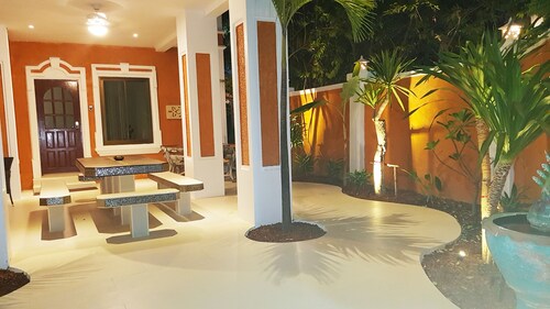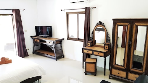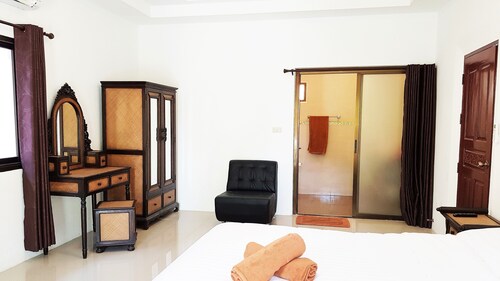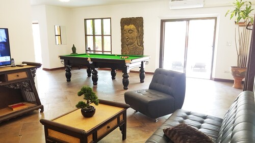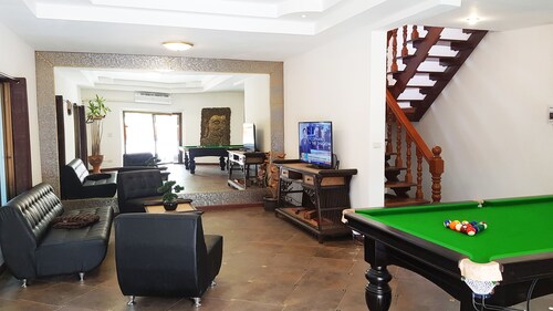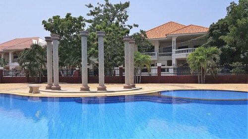 サウス パタヤに位置する、ビーチフロントのこのバケーションホームはゴルフコースにあり、ミニゴルフ・パタヤ、ウォーキング ストリート、ジョムティエン ビーチから 3 km 圏内です。パタヤ ビーチおよびパタヤ ビーチ ロードも 3 km 圏内です。 ビーチで日差しを浴び、このバケーションホームのフルサービス スパでくつろいだりして過ごしたら、バケーションホームにある 20 か所のレストランで食事をお楽しみください。 バケーションホームには、ベッドルーム 5 室、WiFi (無料)、低反発ベッドが備わっています。キッチンには冷蔵庫とオーブンが備わっており、優雅な滞在をお約束するプライベート プランジプール、暖炉もご利用いただけます。