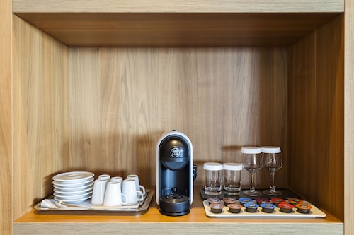 スタンダードクラスとエグゼクティブクラスの内装は、ロビーラウンジ同様、青と白の幾何学ポップ調です。バスルームもポップで、気持ちが明るくなりました。