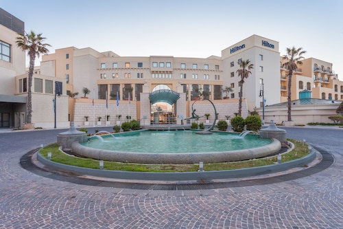 高級マンションが立ち並ぶ、セントジュリアンズのポルトマソ地区にある5つ星ホテルです。空港からの距離は8km。タクシーで約30分の場所にあります。ポルトマソ・カジノやスーパーまでは徒歩1分。スピノラベイ周辺のレストラン街へは徒歩5分。パーチェヴィルの繁華街にも隣接しています。徒歩5分の所にあるスピノラ・ガーデン脇のバス停Ross(ロス)からは、スリーマ(5分)、ヴァレッタ(15分)他、各方面へ行くバスに乗降りできます。ホテルのロビーラウンジからレストランへの吹き抜け部分全体は、青と白を基調とした幾何学模様のカーペットやデコレーション、ポップでモダンな形の家具が散りばめられています。客室は、海に面したオーシャンビュー 、ヨットハーバーに面したマリーナビュー、庭に面したガーデンビューがあり、どの客室にもバルコニーが付いています。スタンダードクラスとエグゼクティブクラスの内装は、ロビーラウンジ同様、青と白の幾何学ポップ調です。バスルームもポップで、気持ちが明るくなりました。また、全ての寝室には、最高に寝心地の良い「ヒルトン・セレニティーベッド」が置かれています。寝室・バスルームともに清潔。設備や備品も充実していま