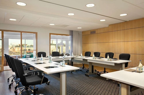 このホテルは、地下鉄Slussenの駅から歩いてすぐのところにあり、ホテルの一部の部屋からは、旧市街、ガムラ・スタンが一望できます。特に、ホテルのすぐ近くから見える、新年カウントダウンの花火の眺めは最高です。現在ホテル近辺は、水位の異なるバルト海とメーラレン湖を繋ぐ水門(Slussen)の改修工事が行われています。これは、ストックホルムの再開発プロジェクトの一つであり、橋の完成は2019年ごろとなっています。ホテルの客室にはミニバーなども設置されています。コーヒーや紅茶、冷蔵庫なども完備してあり、ユニバーサルに使用できる電源コンセントなども設置してあります。ヒルトン系列の会員のためのエグゼクティブラウンジがトップフロアにあり、打ち合わせなどにも利用することができます。朝食、アフタヌーンティー、新聞、さらに夕方には、アルコールやスナックのサービスなどがあります。Eken bar & Matsalのレストランからも、ガムラ・スタンの街並みが一望でき、さらにここでは、オーガニックな食材をベースにしたアラカルトメニューも楽しむことができます。朝食レストランPanoramaでは、スウェーデンの環境認証Kravを受け