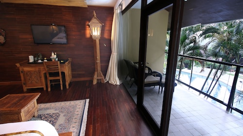 バリの田舎の村を散歩するようなリゾート内は渓谷沿いにのため、客室への通路は坂道ですが、バギーが用意されています。客室の門をくぐると自分の家に帰った様な気分に。プライベートな空間にも眼下はバリのジャングルが広がり、川のせせらぎとやわらかな風を感じられて開放感いっぱい。木でつくられたバリ風の落ち着いた内装に、ヴィラのベッドは天蓋付きでリゾート気分も盛り上がります。