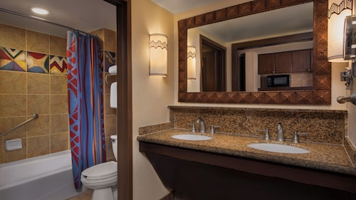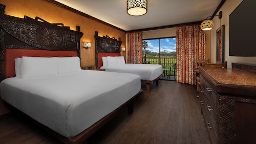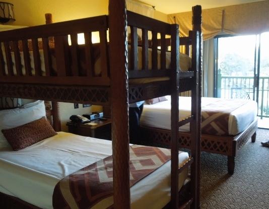 お部屋のカテゴリーには、スタンダードビュー(駐車場など)、プールビュー、サバンナビューがありますが、お勧めはもちろんサバンナビュー!部屋のバルコニーから動物たちのいるサバンナを眺めるという、なんとも贅沢な体験ができます!クイーンベッド2台の部屋と、クイーンベッド1台+2段ベッドの部屋があり、どちらも最大4名まで宿泊できます。部屋の内装や家具も全てアフリカンテイストでまとめられていて、まるでアフリカのサファリにいるかのような気分を満喫できます。ベッドにはモスキートネットをイメージしたものがあったり、壁にはアフリカの街の絵が描かれていたりと細かなところまで楽しめます。アメニティはディズニーオリジナルのシャンプー、コンディショナー、バスジェル、ボディローション、お部屋にはテレビ、ミニ冷蔵庫、ヘアドライヤー、セイフティーボックス、アイロン、アイロン台、コーヒーメーカーなどが揃っています。