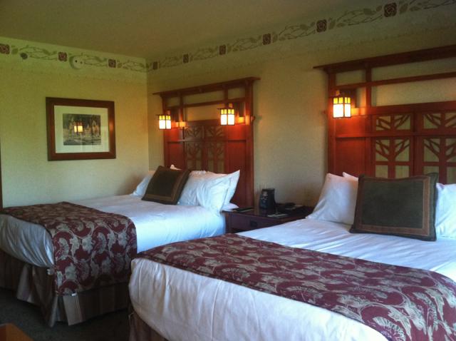 カリフォルニアらしい広大な自然をテーマにしたホテル。ディズニーのオフィシャルホテルの1つです。グランド・カリフォルニアン・ホテルの一番の魅力は何といってもアクセスの良さ。カリフォルニア・アドベンチャーと隣接していて、専用ゲートから入退場が可能。ダウンタウンディズニーも隣です。途中遊び疲れた後、部屋に戻って休憩もできるしパークオープンの混む時間でも専用ゲートから比較的待たずに入れます。予約で事前にお祝い事(誕生日、記念日、ハネムーン)での宿泊と伝えておくとお祝いの言葉と共に風船、缶バッチ、ミッキーのサイン入り写真などチェックインでディズニーらしいおもてなしがありました。外観、内装から木の温もりを感じられる建物でホテルの中に入ると天井の高い吹き抜けのロビー。暖炉やピアノ演奏もしており、とても落ち着いた雰囲気です。特に今の時期は吹き抜けのロビーに巨大なクリスマスツリーが飾られ見物。パークでは、かなり並ぶサンタとのグリーティングもここでは意外と待たずに写真撮影できてオススメです。部屋は”ミッキーがいっぱいの部屋”というよりは隠れミッキーがいる”大人ディズニーな雰囲気の部屋”という感じです。枕は柔らかくベッドは硬め