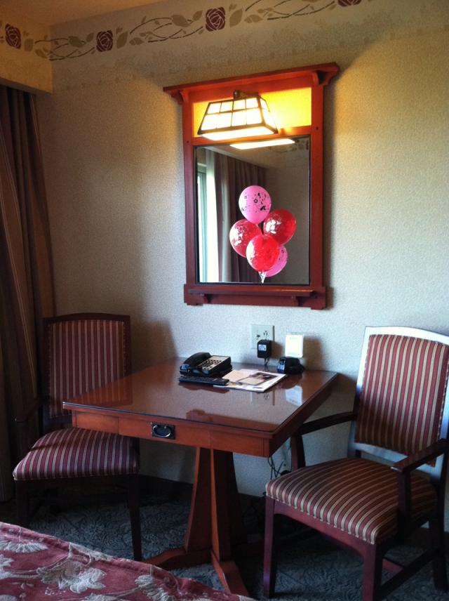 お祝いの言葉と共に風船、缶バッチ、ミッキーのサイン入り写真などチェックインでディズニーらしいおもてなしがありました。