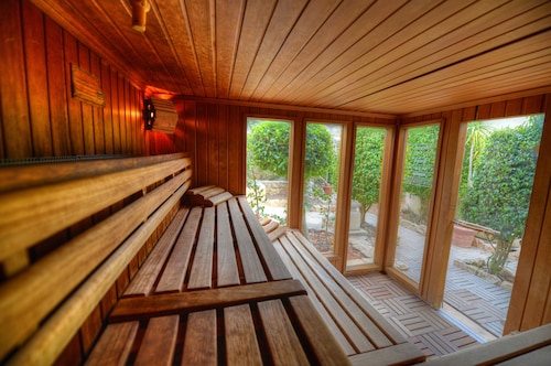 そして、円錐型天井の室内プールと岩に囲まれた屋外プールが連結している魅力的な温水プールがあります。