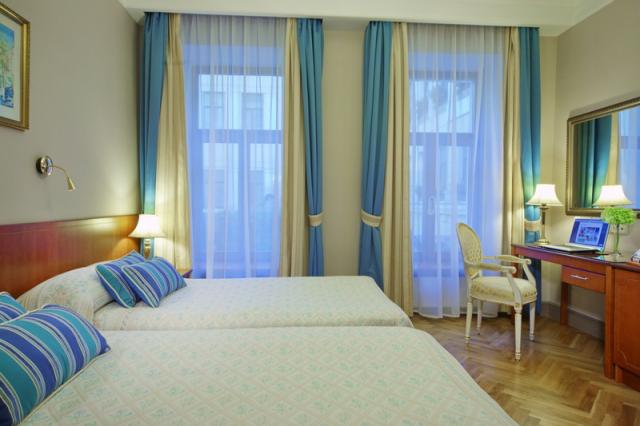 18世紀の邸宅を利用したこのホテルは、ネフスキー大通りからマラタ通りに入ってすぐの好立地に位置し、エルミタージュ美術館やカザン聖堂、国立ロシア美術館などの観光名所が徒歩圏内。地下鉄マヤコフスカヤ駅にほど近く地下鉄移動も便利です。24時間営業のスーパーも近くにあります。建物はスイスの建築家が設計し、外装・内装ともに素朴でいて高級感のある愛らしいデザインです。スイス領事館も入っておりホテル入口にはスイス国旗が掲げられています。ヘルベティアというホテル名はラテン語で古代のスイス地方を意味するそう。大きなホテルではありませんがセキュリティがしっかりしており、安心して利用できます。チェックインの際ウェルカムドリンクのシャンパンとケーキのサービスが。フロントのコンシェルジュやスタッフは常に笑顔で応対、ツアーの手配や観光案内なども快く行ってくれます。お部屋も18世紀の旧邸宅の雰囲気を残し、高級感と快適さを兼ね備えた空間になっています。Wi-Fi使用可能、ミニバー、金庫も完備。浴槽付のバスルームで、ボディローション・シャワーキャップなどのバスアメニティも充実。ひとつ気に留めておきたいのはエレベーターが全館完備ではないこと