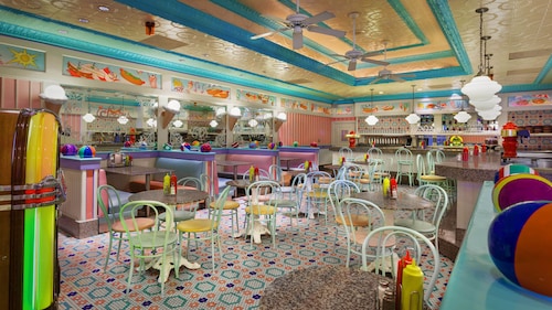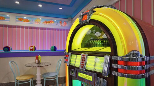 プール沿いにあるアイスクリームショップ「ビーチズ&クリームソーダショップ」では、ハンバーガーなどの食事メニューとアイスクリームソーダやサンデー、シェイクなども充実しています。グループサイズのキッチンシンクサンデーはアメリカンサイズで驚くこと間違いなしです!テーブルとイスがアイスのようなデザインになっていて、かわいらしいお店です。また、並びにはアーケードやゲームルームもあるので、ちょっとお散歩で寄ってみてはいかがでしょう。